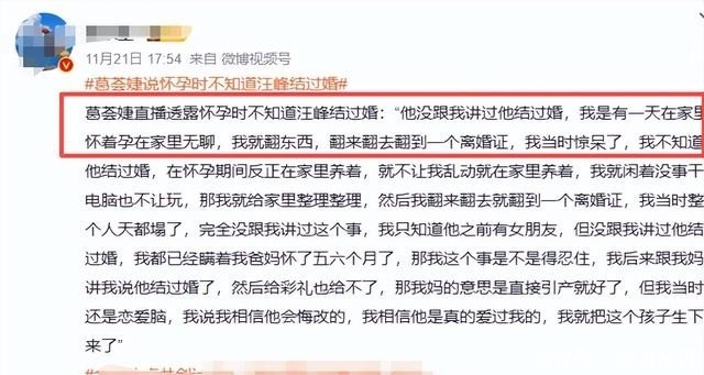 首先就是她表示自己怀孩子的时候,不知道汪先生结过婚,也是够炸裂的,